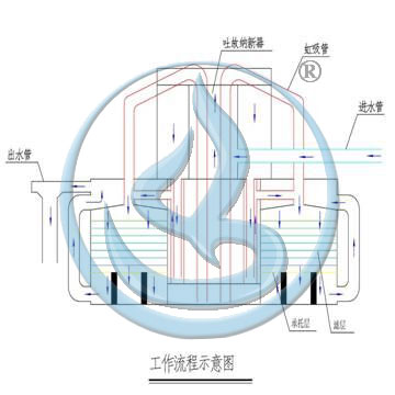 自來水由進水管送入設備,經過濾層清水從連通管進入清(沖洗)水箱內貯存。水箱充涌后,進入出水槽,通過出水槽螺旋曝氣充氧裝置再次曝氣充氧出水。