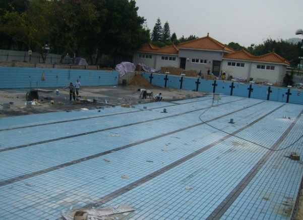 鋼筋砼池分二步施工,第一步施工底板,第二步施工池壁,底板以上100處設施工縫,砼泳池施工完后,進入裝修。