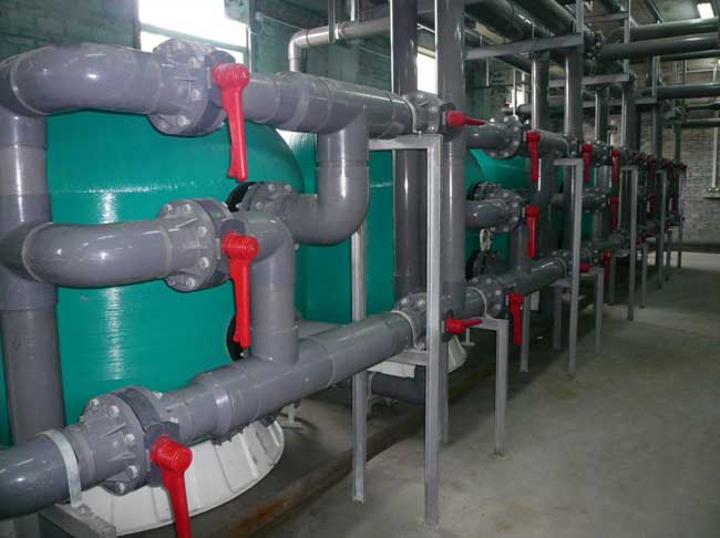 游泳池循環(huán)水凈化設(shè)備機(jī)房應(yīng)設(shè)均衡水池(平衡水池)、循環(huán)水泵、過濾器、加藥裝置、換熱器、消毒設(shè)備、藥品庫、控制設(shè)備等,并宜按工藝流程順序排列。
