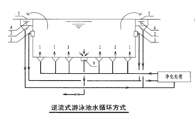 逆流式循環即泳池內的全部循環水量經設在池底的給水口或給水槽送入池內,再經設在池壁的溢水槽取回使用過的相應體積的水,進行凈化(加藥、過濾、加熱及消毒)后再送回池內繼續使用的水流方式。
